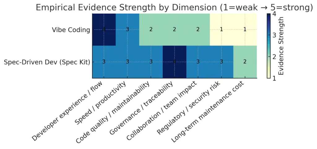 The heatmap shows that evidence is strongest for developer experience and speed in vibe-coding, and for governance, traceability, and structured workflows in spec-driven development—while both remain under-researched in long-term maintenance and security dimensions.